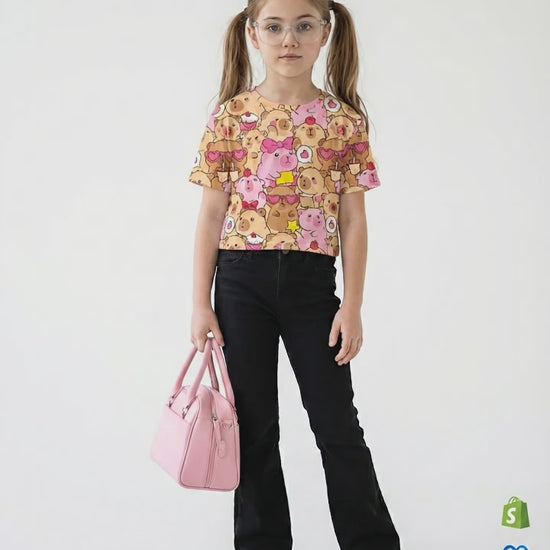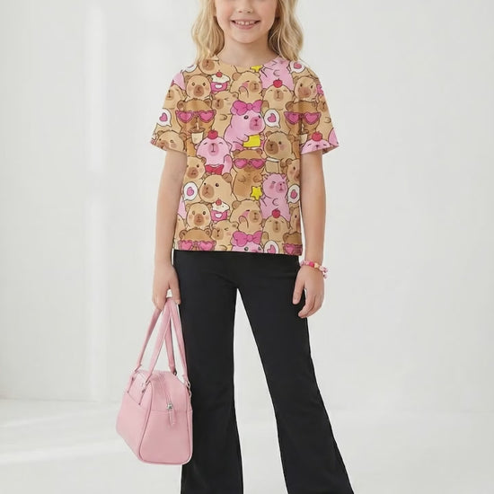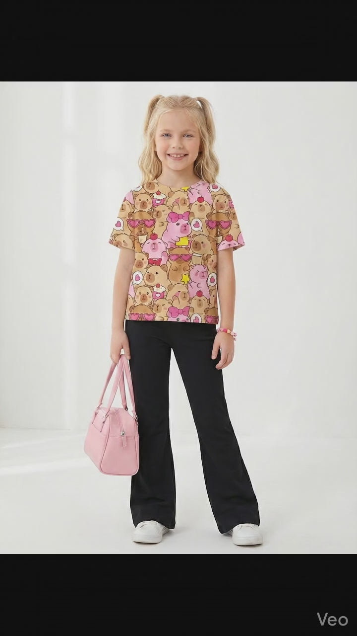Capybara Print Two-Piece Set white t-shirt & brown bottom