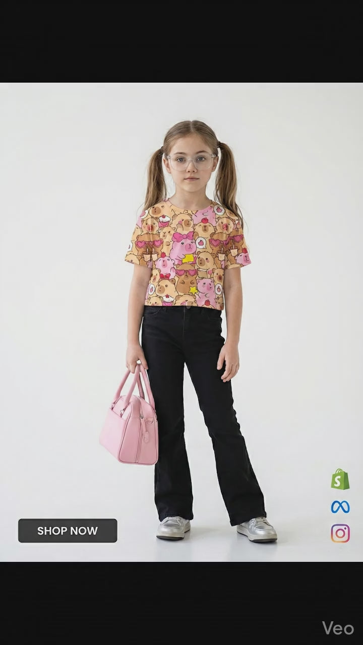 Girls' Casual Floral T-Shirt and Flare Jeans Set.