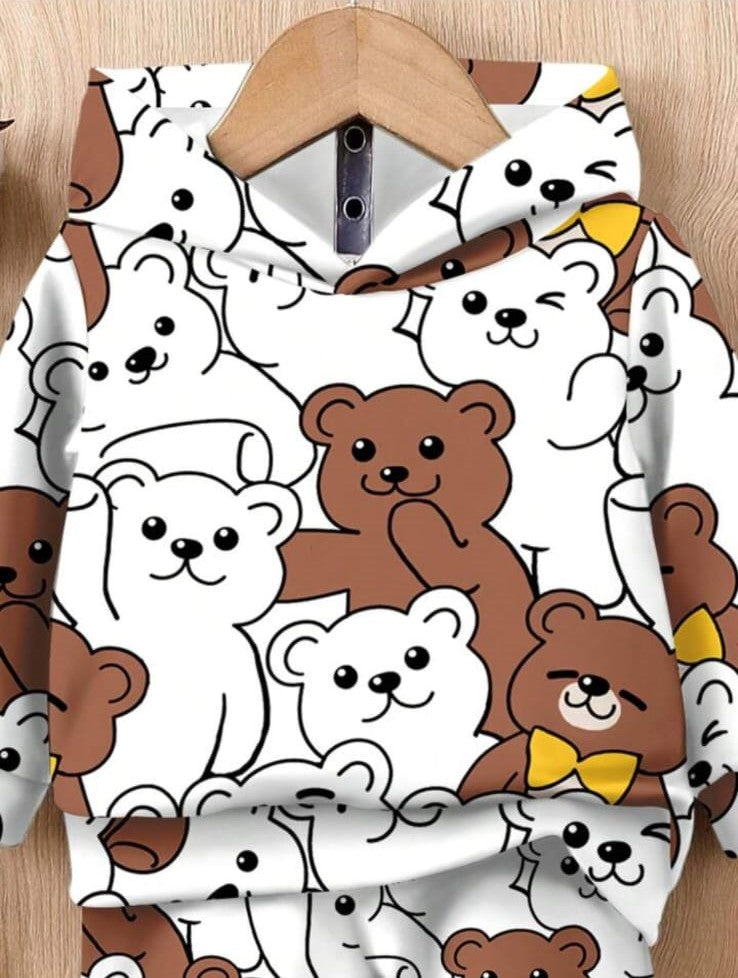 all-over cartoon print of bears and small orange bows. & brown pant
