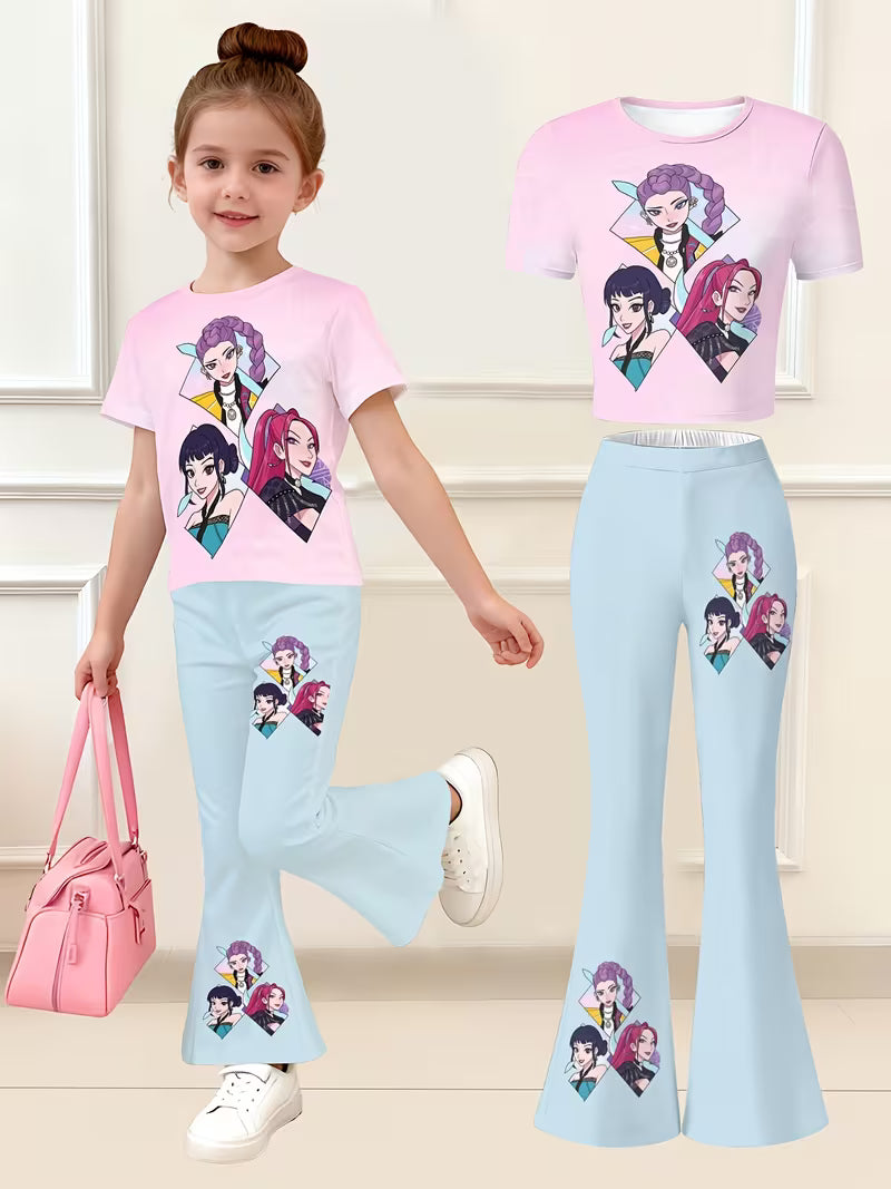 Cartoon Print Short Sleeve T-Shirt And Flare Pants Set, Soft And Machine Washable, Spring